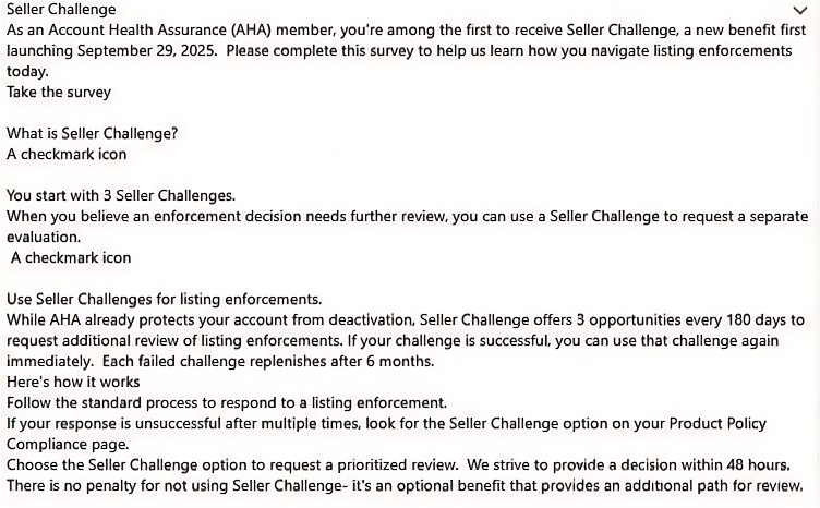该功能适用于“列表级处罚”,卖家可最多发起三次挑战,每次结果将在48小时内反馈。若卖家在此期间失去AHA资格,未使用的挑战机会将自动失效。