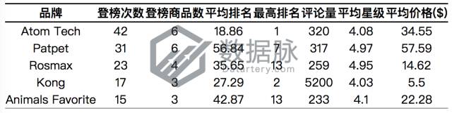 同 时,在上周中品牌 KONG 的一款宠物狗飞盘玩具也有着良好的榜单发挥,凭借在一周中三次跻身榜单前二的表现,这款宠物玩具以3.86的平均排名位列综合排名第二的位置。