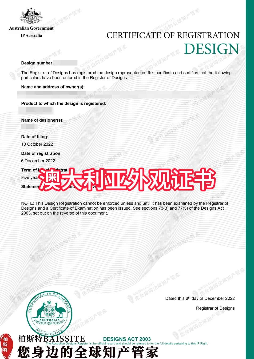 【知识产权证书分享】澳大利亚外观专利证书样本