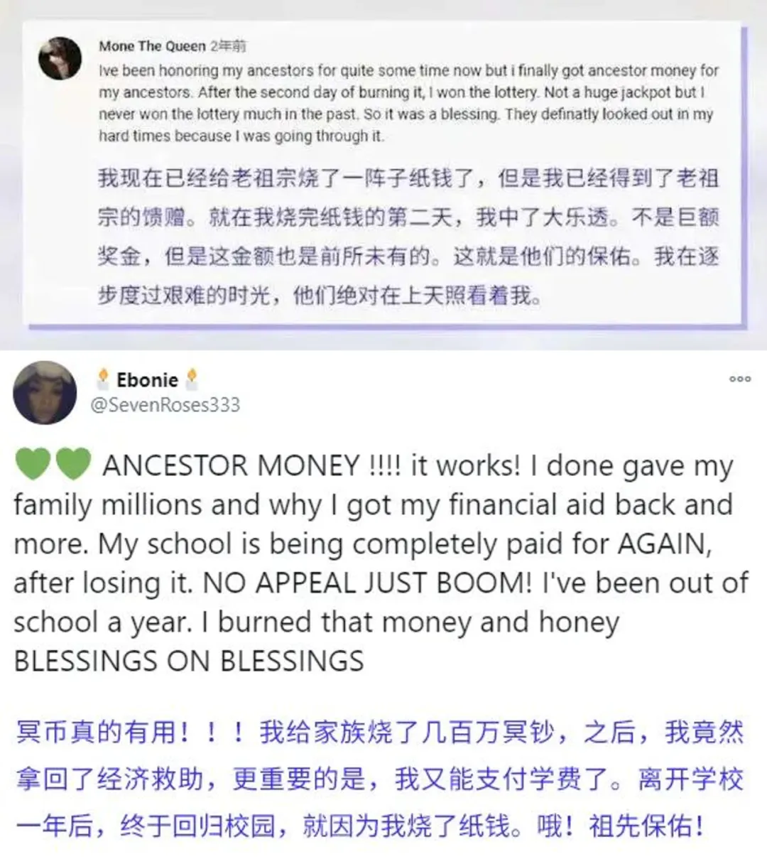 之所以叫祖先钱,是因为老外真把这当成了许愿神器,使其从殡葬用品摇身变为玄学载体,拥有许愿池里的王八、转发中奖的锦鲤一样的效果,有人声称烧币后中了彩票,有人拿到奖学金,甚至有人找到亲生父母。