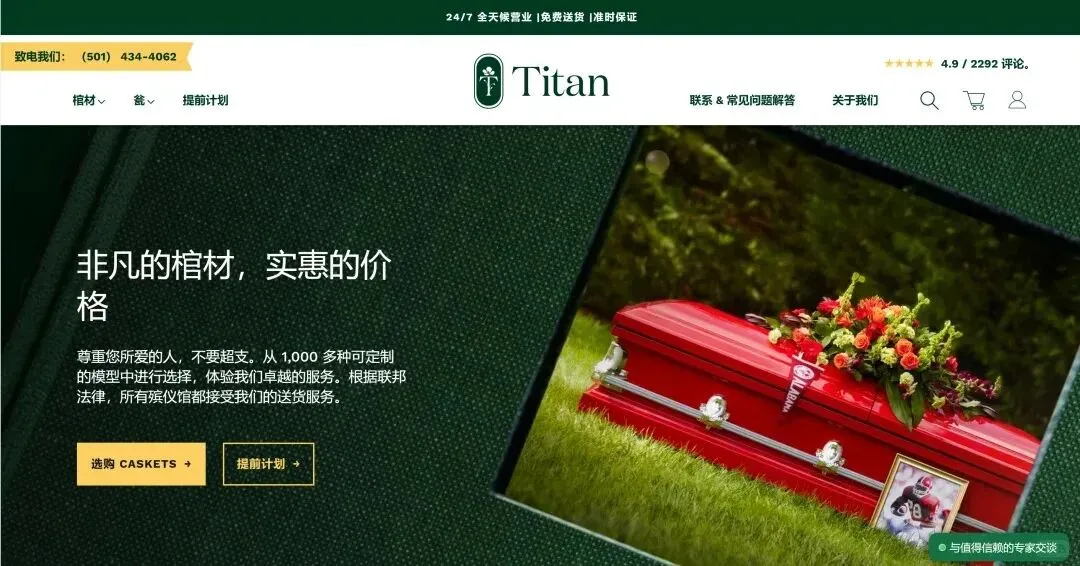 美国品牌Titan Casket通过成立独立站绕过殡仪馆垄断,将棺材售价降至殡仪馆的1/3(均价1000美元左右),凭借超过1000个SKU的个性化定制和人性化服务,成功撬动被传统巨头把持的市场。2024年12月,其独立站在线月销售额突破90万美元。
