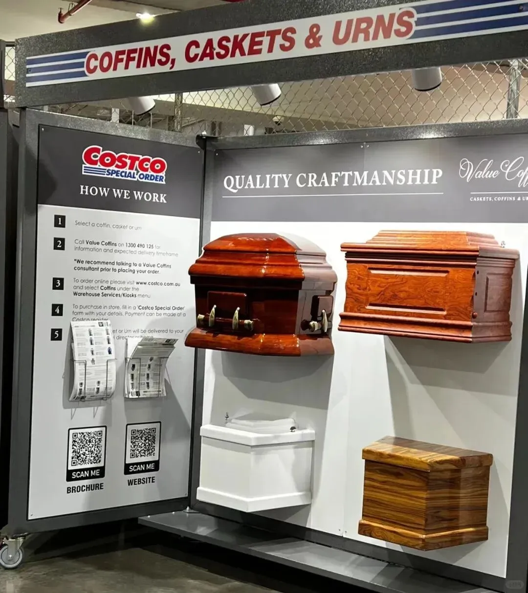 比如Costco早在十年前就已将棺材纳入超市货架销售,黑五的时候在官网买甚至有第二个半价(拼好棺)。