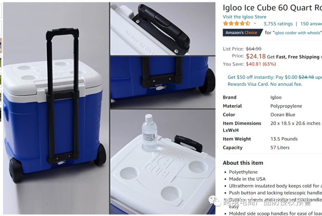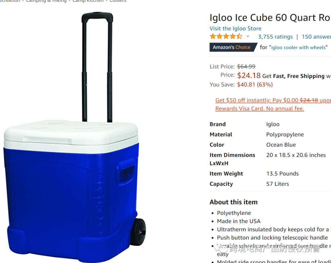 不过,该手提冰柜的美国外观已经于近期无效了,所以,现在开始售卖同款冰柜,基本不会造成专利侵权了!!!