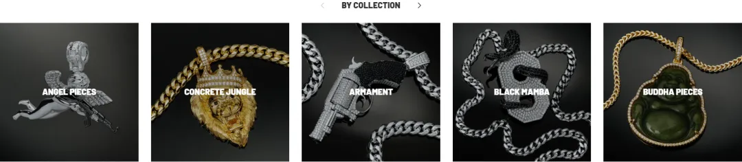 King Ice从一开始就将自己绑定在“嘻哈/街头+奢感”这一单一风格坐标上。产品设计长期围绕粗、满钻元素、夸张尺寸与强金属质感展开,几乎不做风格分散尝试。同时,它持续与说唱歌手、街头文化IP及流行文化形象合作,让产品始终出现在具体、真实的文化语境之中。