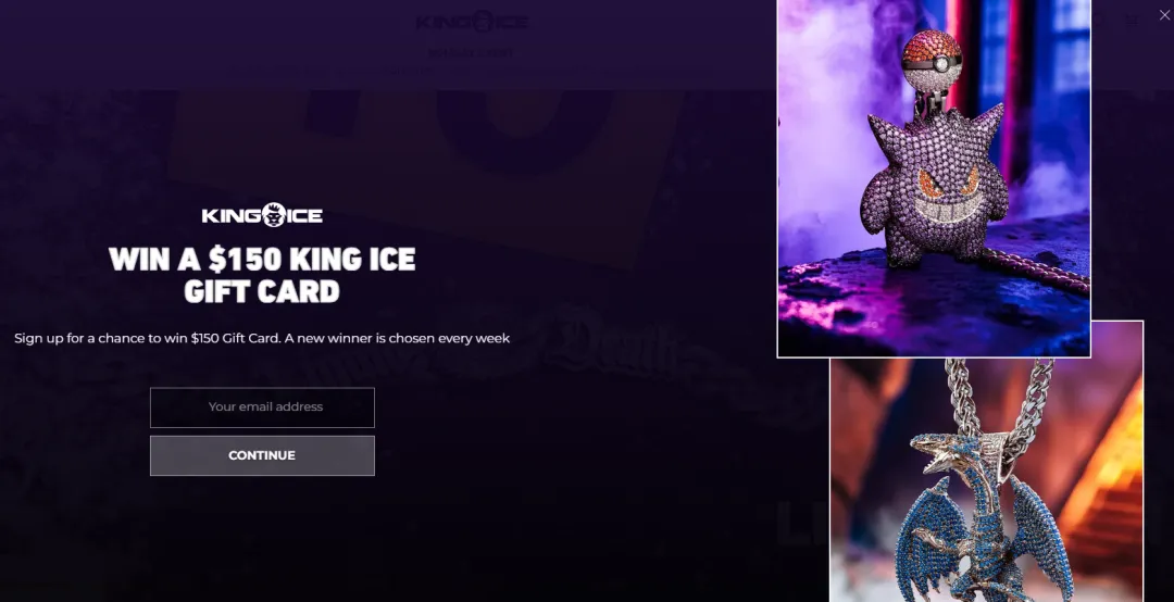 在多数电商场景中,订阅邮箱或短信常被用户视为单向营销动作,因此转化率有限。而King Ice采用的方式是,将订阅行为重新包装为一次低风险、高回报的参与机会:用户订阅即可参与价值150美元礼品卡的抽奖,无需立即下单。