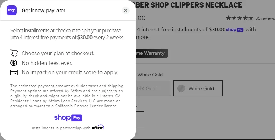 对潮流饰品而言,即便消费者已经认可设计与文化,但单价100到200美元的定价,仍然会成为下单前的心理门槛,尤其是年轻消费群体。为此,King Ice在结账环节引入先买后付方案,将总价拆解为“每两周一次、无利息的小额支付”,并明确标注“无隐藏费用、不影响信用评分”。