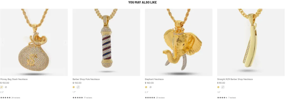 King Ice在产品详情页设置了“YOU MAY ALSO LIKE”模块,围绕同价位、同文化或同主题风格,推荐相关项链与饰品,引导用户进行横向比较与延伸浏览。当消费者在多个风格一致但细节不同的产品之间反复比较时,购买意愿往往会被进一步强化。Redstagfulfillment数据显示,恰当的配套产品或升级产品推荐可以将订单价值提高10%~30%。