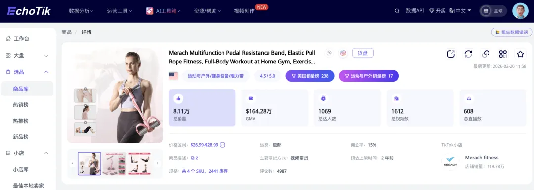 据Echotik数据显示,专业健身品牌Merach在TikTok的小店 Merach fitness(@merach.us),这款脚踏阻力带卖出了8.1万件,总GMV达到了1200万人民币,近1个月卖出了1万多件,销售额210万!