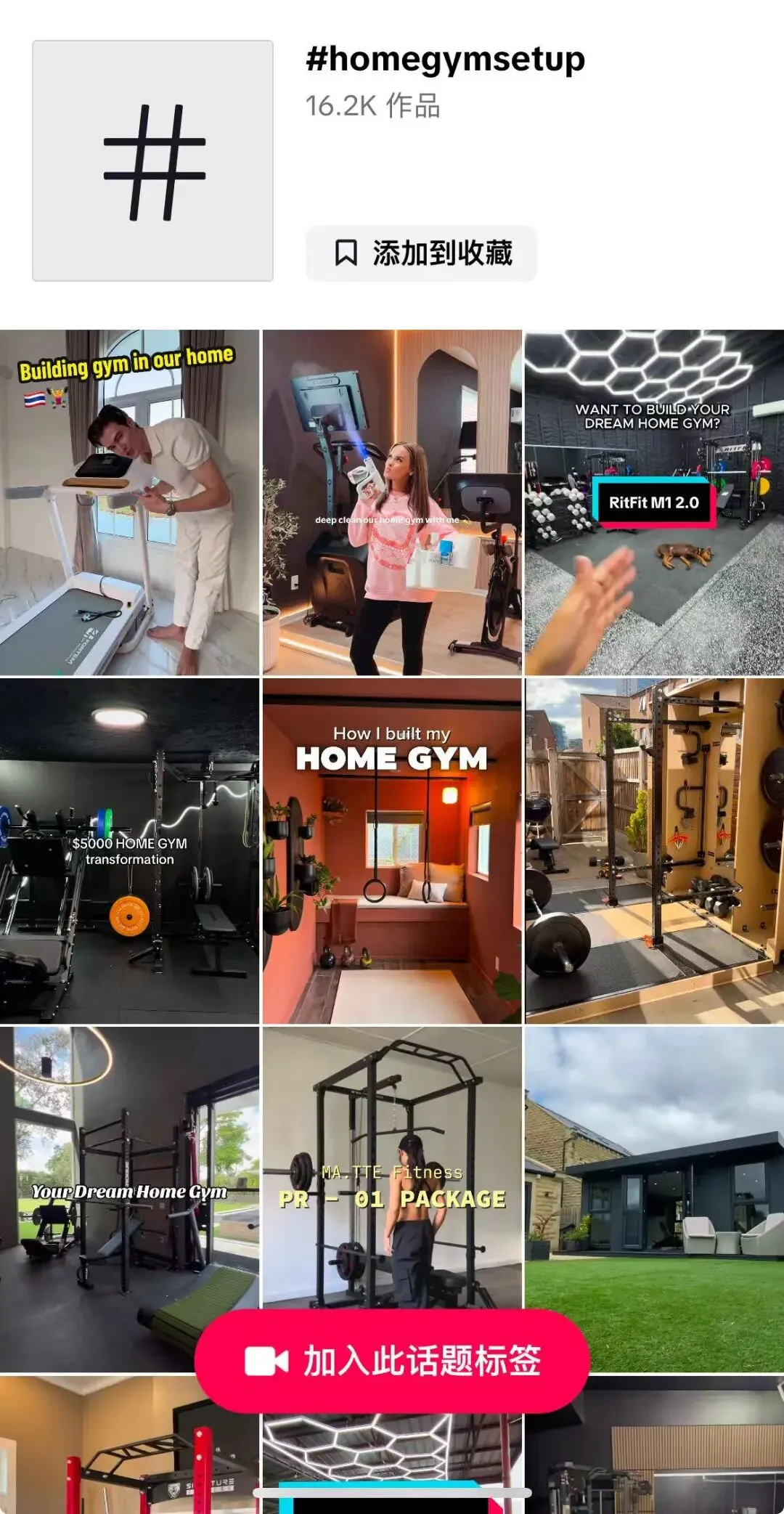 趋势话题标签#myhomegymsetup(专属健身角落搭建),在TikTok已经积累了1.6万多个作品。