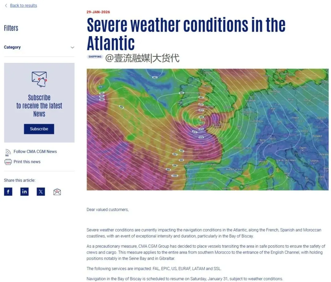 目前天气状况正在好转,西南欧和西欧的码头预计最迟将于1月30日恢复运营,不过具体恢复如何还是要视天气情况而定。