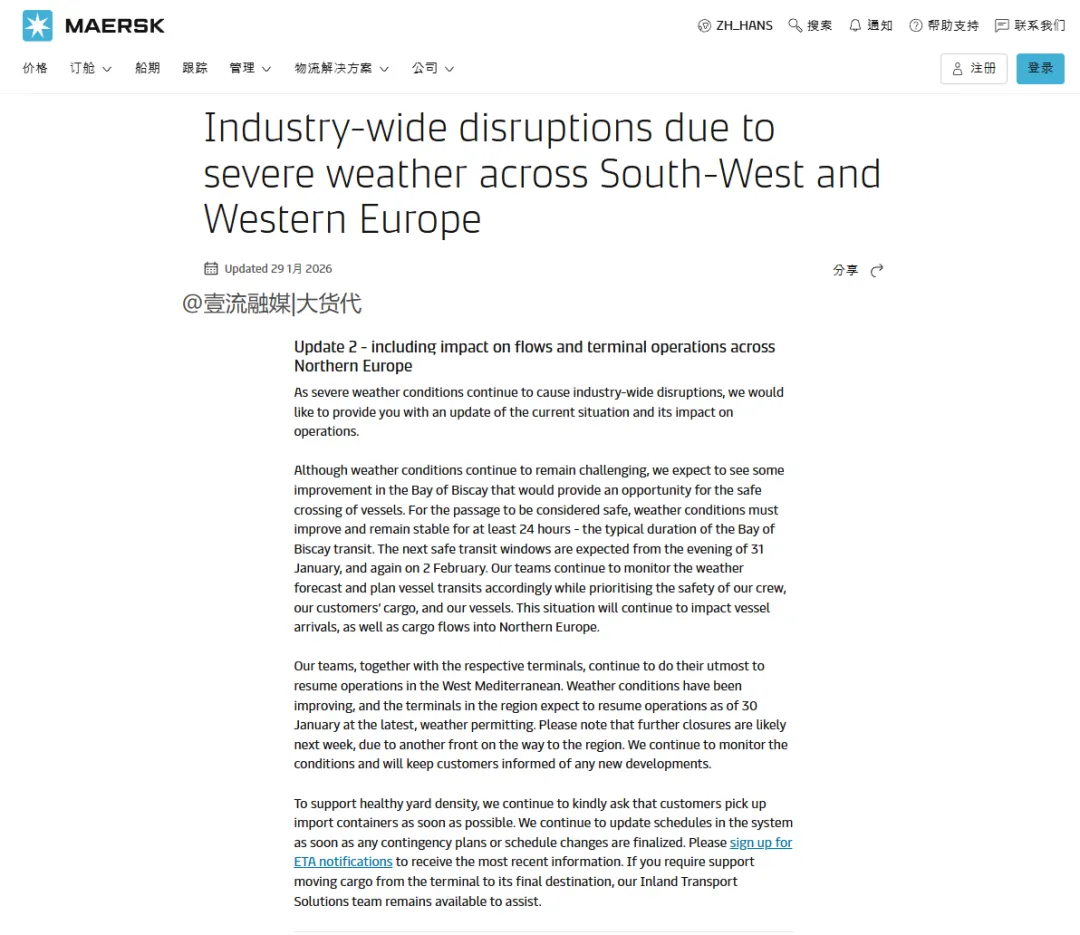 同在当地时间1月29号,马士基也更新了西南欧和西欧的货运物流情况。