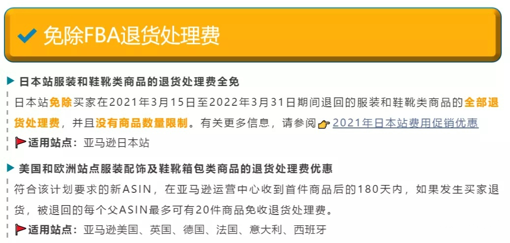 现在日本站卖家可结合实际业务情况,添加更多新选品了,而且卖家可借助“亚马逊物流新品入仓优惠计划”,节省上新成本。符合该计划要求的FBA新品,可限时享受免费广告、免费仓储、免费移除、免费退货处理等5重大礼。