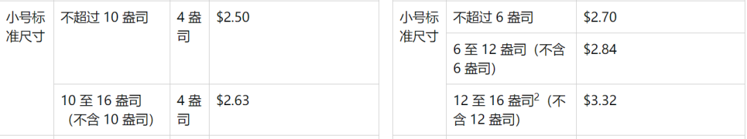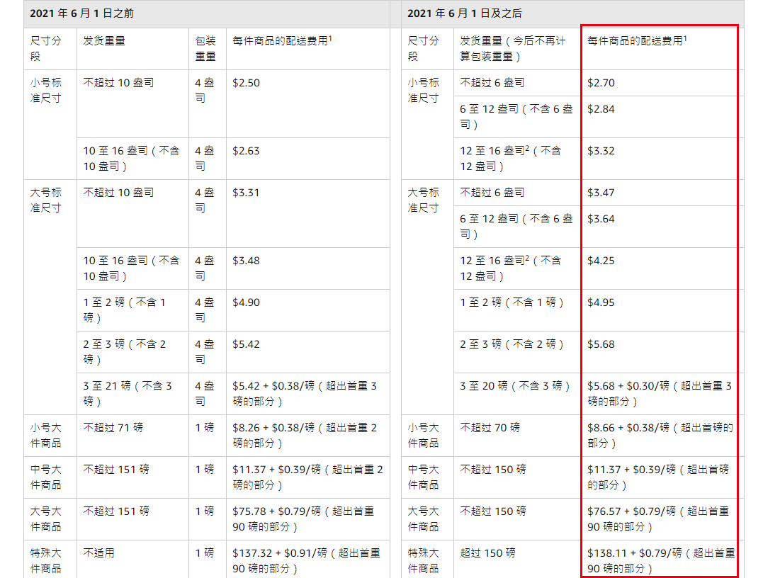 核心亚马逊物流配送费用变更(“服装”类商品除外)如下表,新的配送费用将于 2021 年 6 月 1 日起生效。
