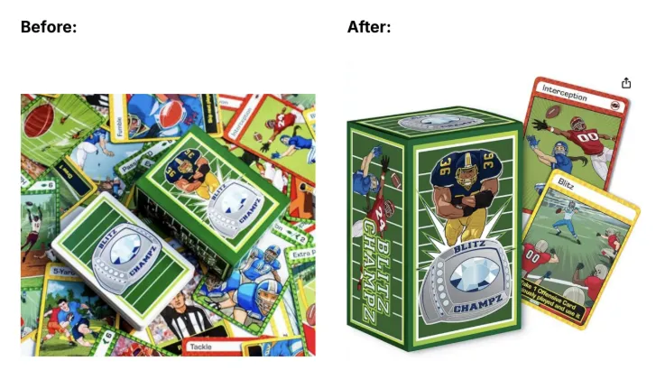 真实案例:客户Blitz Champ的卡牌产品,原本主图背景杂乱,产品不突出。优化后去掉多余背景,在包装盒旁添加2张卡牌,清晰展示内部内容,点击率显著提升。