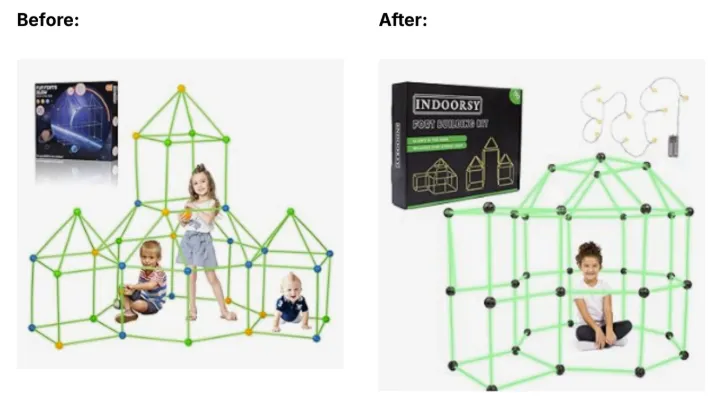 真实案例:客户Indoorsy的儿童玩具,优化时将产品颜色调整为亮绿色,搭配产品内部的灯串展示,画面瞬间有了吸引力,点击量大幅提升。