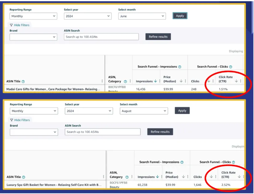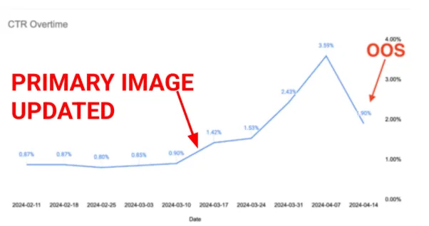 真实案例:客户Blossoma的产品,优化后主图添加“25 Pack”标签,展示包装内部内容,同时用树枝填充画面,点击率从0.67%提升至1.0%。