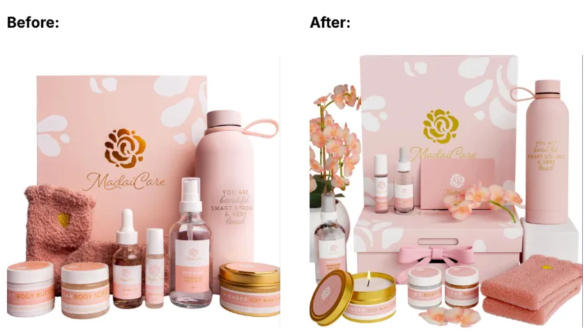 真实案例:客户MedaiCare的蜡烛和精油套装,原本主图留白过多,显得廉价。优化后添加花盆填充留白,调整产品摆放,搭配更好的灯光和阴影,点击率从1.5%飙升至2.5%。