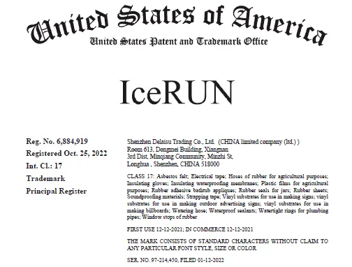 原告ALBION BRAND FOUNDRY LTD,是一家在英国成立的私人有限公司。是本案维权商标ICERUN的所有者。原告通过授权第三方电商平台(如 Walmart.com)推广、销售带有ICERUN 商标的产品,产品包括电气胶带、农业用塑料薄膜、绝缘防水膜、浇水软管等,属于国际分类第 17 类。