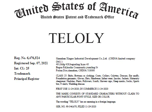 原告BRIDLINGTON BUD LTD是英国成立的私人有限公司。是本案维权商标TELOLY的所有者。原告通过授权第三方电商平台(如 Walmart.com)推广、销售带有 TELOLY 商标的产品,产品包括腰带、下装、帽子、袜子、T 恤、头饰、手套、鞋垫、外套及相关服装配饰等,属于国际分类第 25 类。