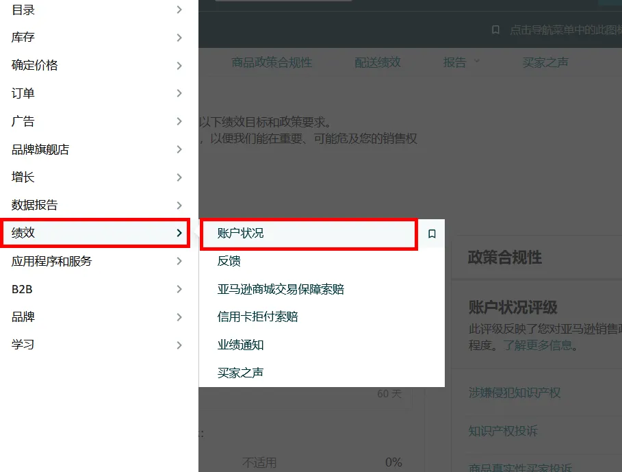 登录亚马逊卖家平台,点击“绩效>账户状况”;