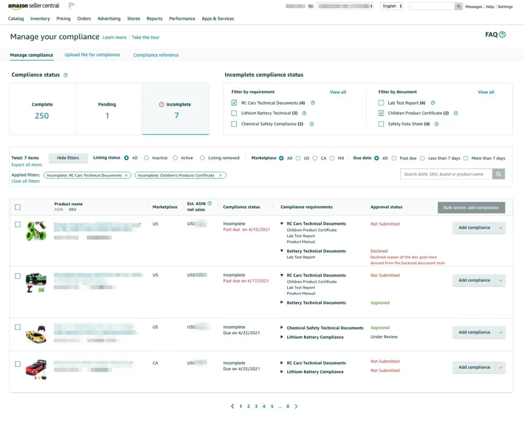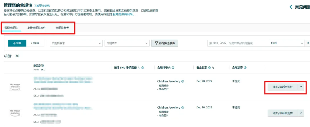 在“账户状况”页面的右下角,点击“管理您的合规性>商品合规性请求”,并找到您要采取措施的商品,点击对应的“添加或申诉合规性”按钮;