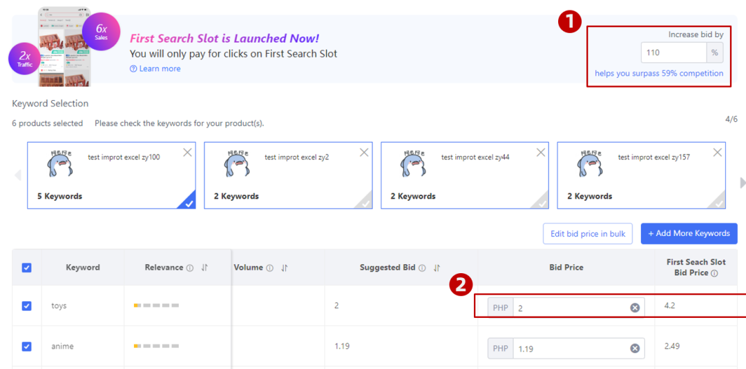 展示位置不可选择,在公平的出价机制下,商家可以选择手动出价大于等于建议值,或者使用自动出价,获得更靠前的曝光。同时,优秀的商品质量分的商品更容易获得靠前的曝光排位,商家也可以选择店铺的头部品优先投放,确保推广效果。