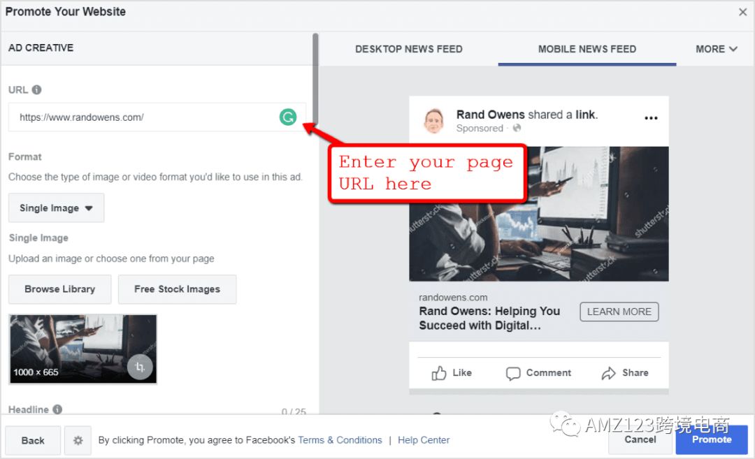 在“Promote Your Website”窗口中,指定你要推广的网页URL地址。请注意,你可以在右侧看到多个广告展示位置预览: