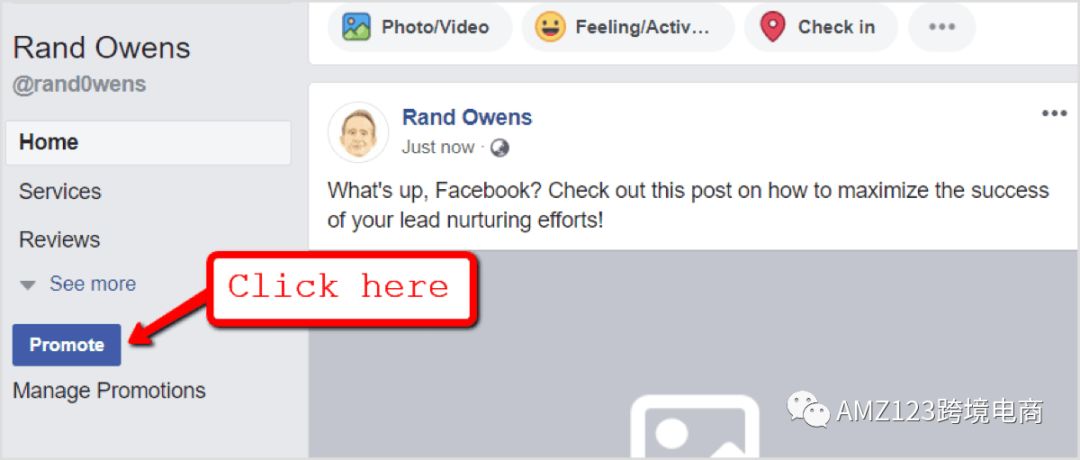 有效地在Facebook上投放广告需要你了解多种受众定位、不同的广告格式以及可最大限度提高广告效益的做法。首先请转到Facebook页面,然后单击导航选项卡下方的“Promote”按钮: