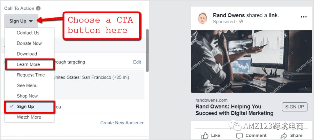 Facebook通过为所有广告系列类型提供预定义的CTA,简化了此过程,你可以使用“Sign Up”和“Learn More”这两个CTA按钮开发潜在用户: