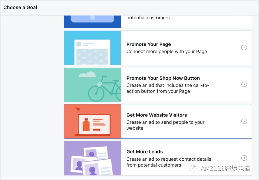 要创建Facebook广告系列,并引流到用户开发页面,你需要向下滚动目标列表,然后选择“Get More Website Visitors”: