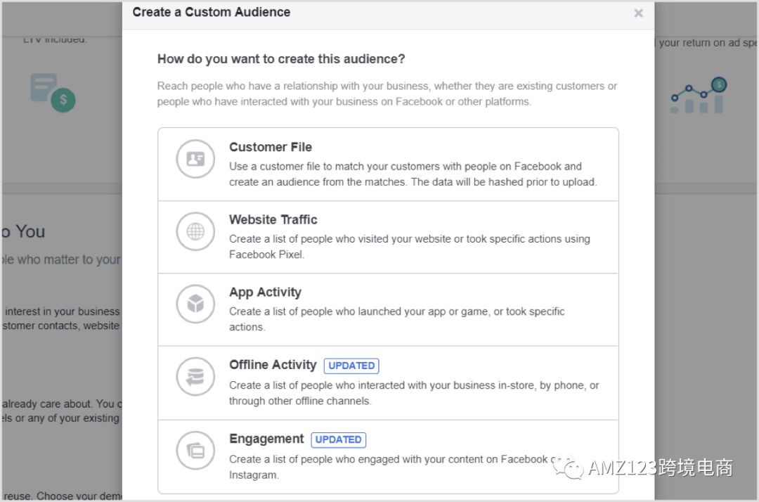 或者,你可以构建自定义受众,使用其他数据源的信息,例如链接到Instagram帐号、特定的Facebook活动和线下活动等。
