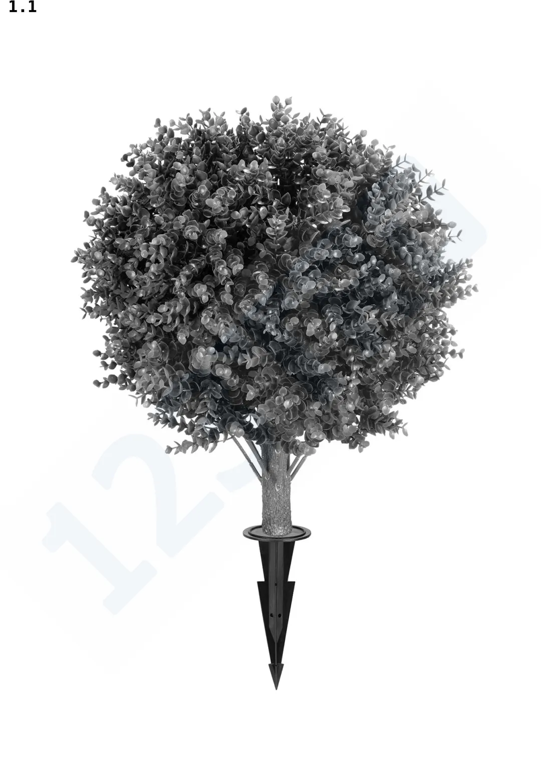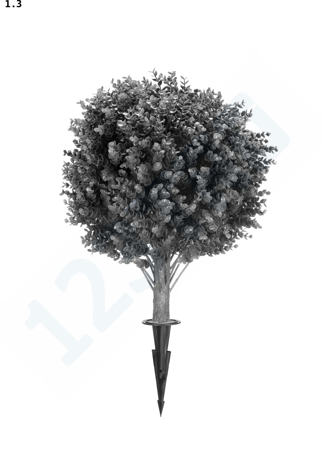 这看上去是仿真尤加利树,树干末端采用地钉结构,可以直接插在花盆,或室外的地里