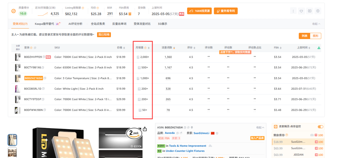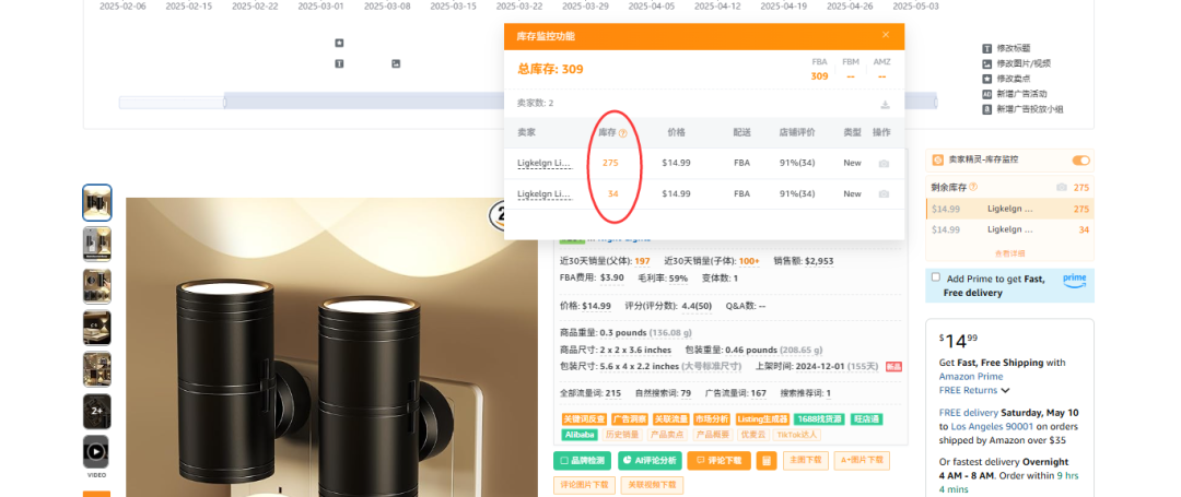 - 根据竞品Add to Cart次数/BSR排名变化,估算其FBA库存(例:BSR排名日跌50%+Add to Cart骤减=库存不足),如果竞品没有设置限购,还可以使用卖家精灵查看竞品库存数量。