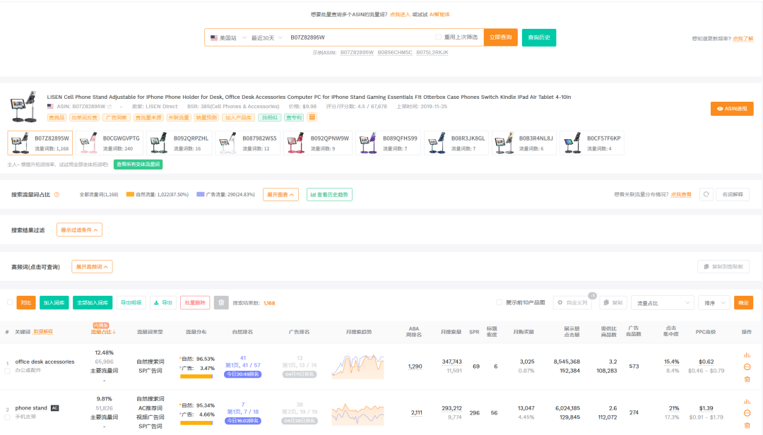 - 导出竞品TOP10出单词,这里用的是卖家精灵,按搜索量/竞争度排序,优先投放长尾词(长尾词转化率高3倍)。