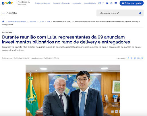 9月15日(星期一),99公司代表在与巴西总统路易斯·伊纳西奥·卢拉·达席尔瓦的会晤中宣布,将对其外卖业务99Food的投资翻一番,在运营的第一年(截至2026年6月)将达到20亿巴西雷亚尔。凭借这笔新投资,该公司的目标是到2025年底覆盖15个城市,到2026年1月覆盖20个城市。目前,该公司在戈亚尼亚和圣保罗开展业务。