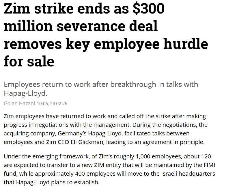 2月24日,备受关注的以星航运(ZIM)罢工事件迎来转折性进展。随着收购方德国赫伯罗特(Hapag-Lloyd)承诺拨付至少3亿美元(约合人民币21亿元)用于员工补偿,以星海法总部及各地办事处已正式复工,这为双方的跨国并购案扫清了最棘手的阻碍。