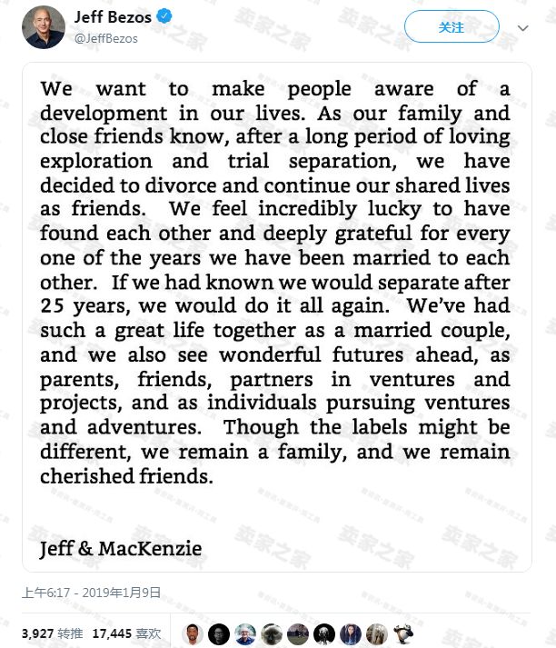 卖家之家获悉,据外媒昨日(2019年1月9日)最新报道,世界首富杰夫·贝索斯(Jeff Bezos)结束了和他妻子麦肯齐(MacKenzie)长达25年的婚姻。昨日上午,这对夫妇在贝索斯的Twitter(推特)账户上发布的联合声明中宣布离婚。