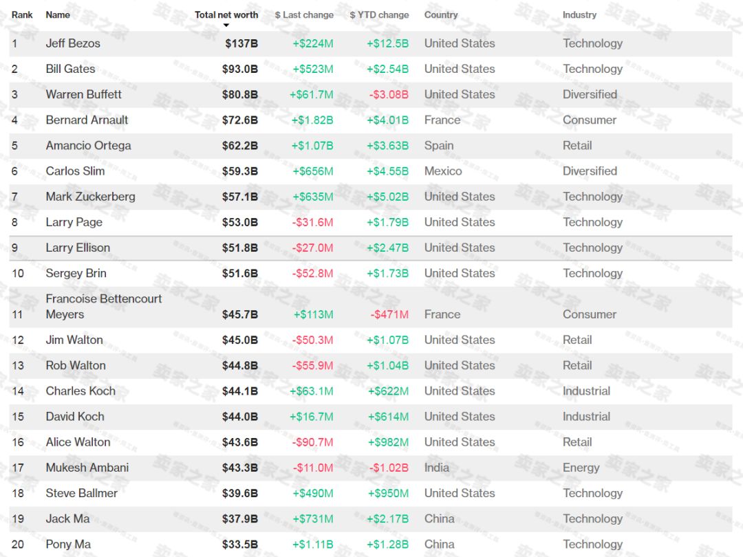 从排名来看,贝索斯以1370亿美元稳居第一,来自中国的马云和马化腾分别以379亿美元和335亿美元位居第19和20名。