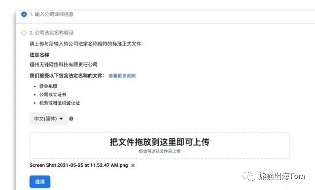 3. 在下一页面确认验证公司详情的准确性并上传要求提供的文件