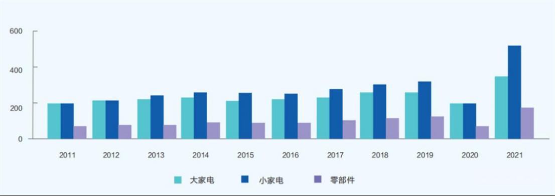 目前,全球小家电市场仍处于成长期,细分品类多,具备较高的增长空间。据中国家用电器协会测算,未来三年小家电行业的全球复合增速有望保持在10%左右。中国小家电产业目前年产值约5300多亿元,其中出口占比超过65%,2021年中国小家电出口量达33.4亿台,出口额达521.2亿美元。小家电细分至烤箱品类来看,美国是我国烤箱出口第一大市场,出口金额及数量均居第一位,2021年出口金额4.99亿美元,占全部出口的30.22%,同比增长17.65%,出口数量1188.32万台,占全部出口的28.36%,同比增长1.50%。