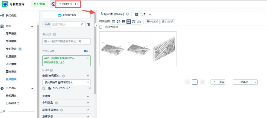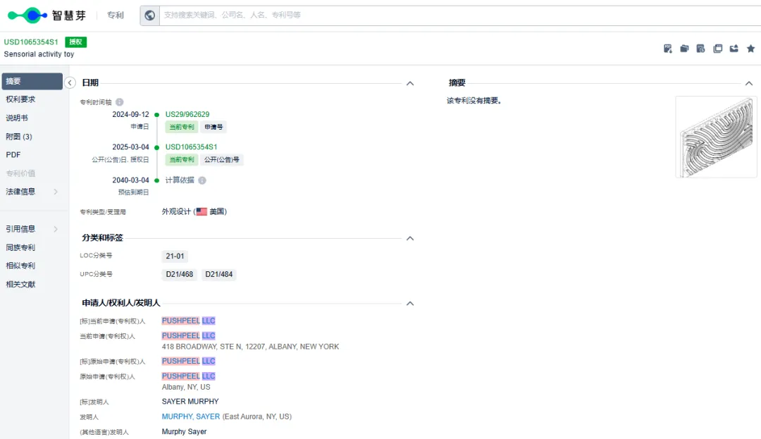 用权利人PUSHPEEL LLC查询,可以看到能查到权利人名下专利产品详情。