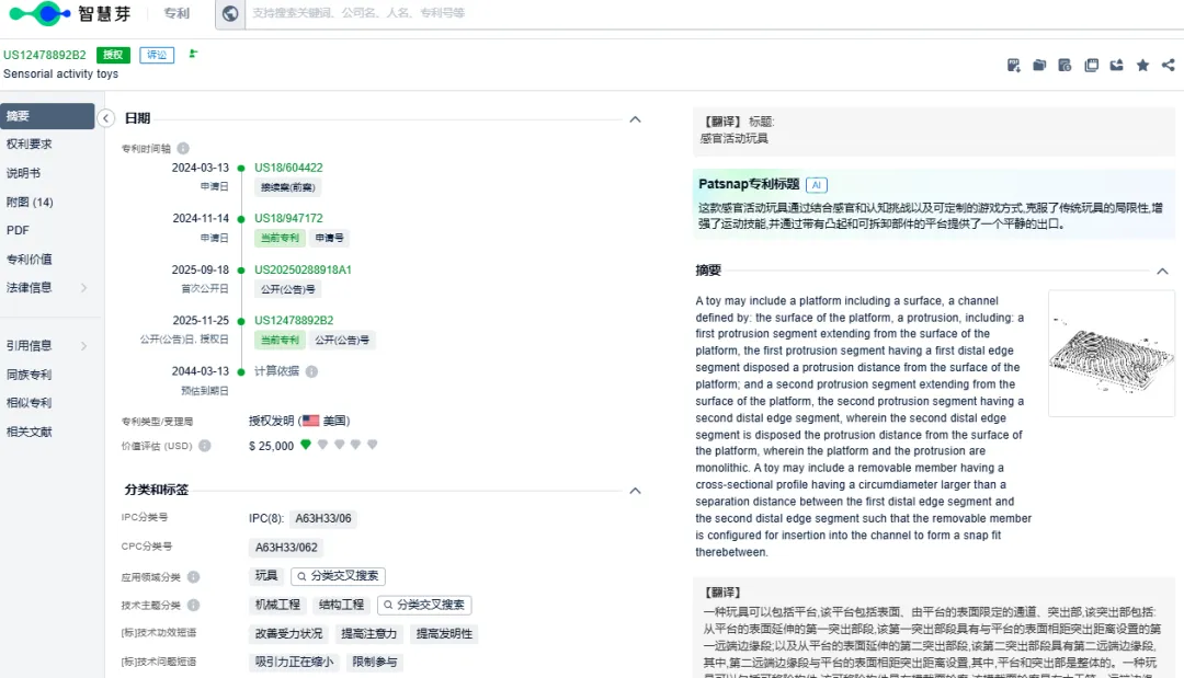 经查询于这款Sensorial activity toys儿童感官玩具产品于2024年11月14日申请,于2025年11月25日在美国获得授权,发明专利(专利号:US12478892B2)。