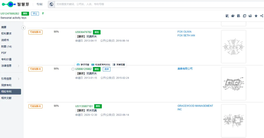 本次主要针对这款Sensorial activity toys儿童感官玩具产品进行分析!该品牌权利人名下专利产品,给大家列举专利产品如下!
