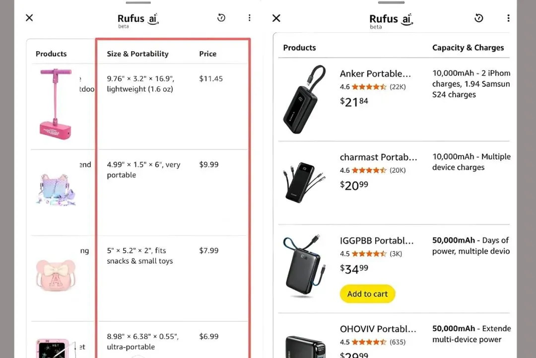 买家搜产品时,图片下方直接出现Compare,勾选1-5款同类产品,AI瞬间生成专属对比面板,连Listing都不用点,看完直接决定买谁!