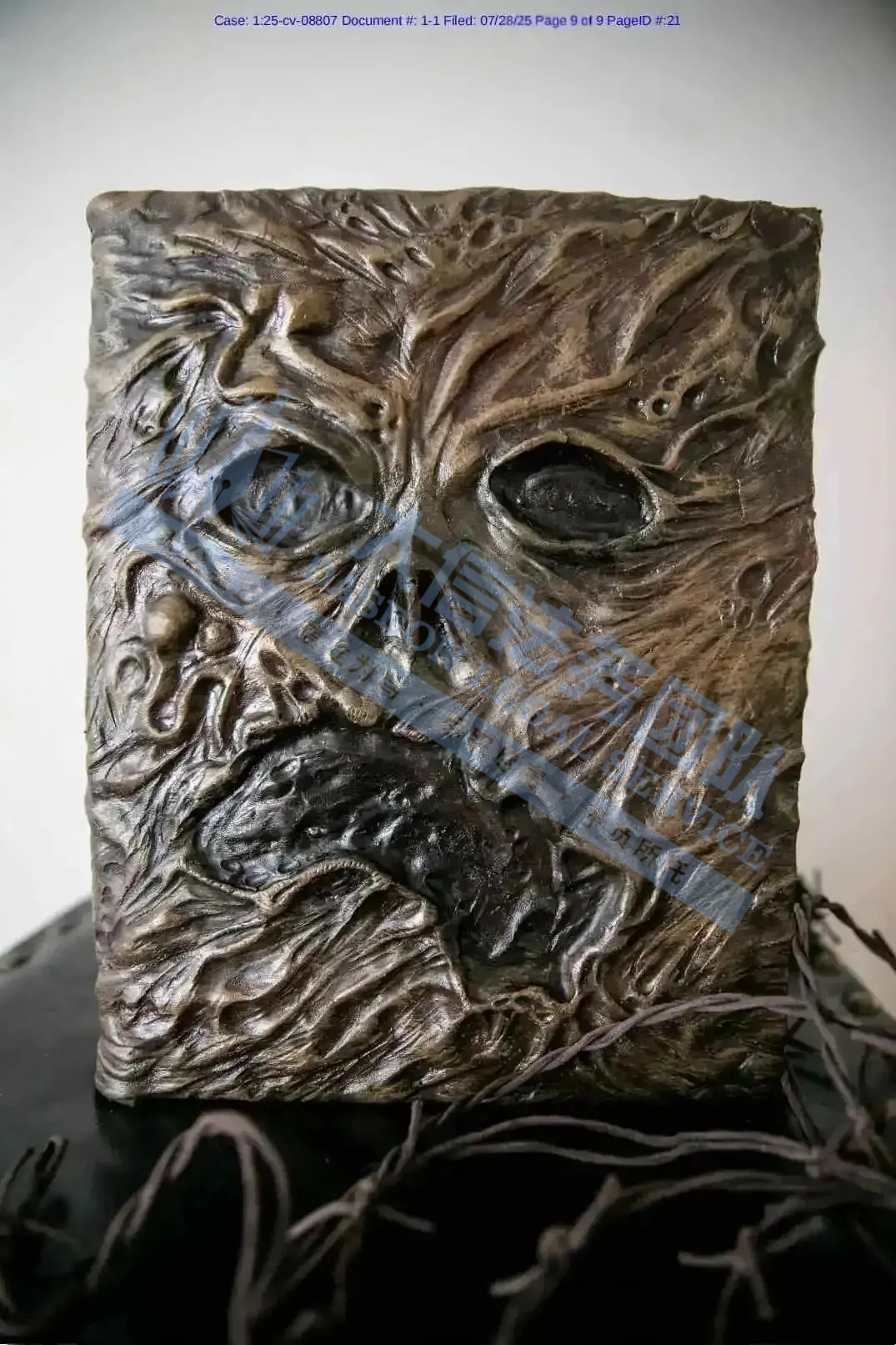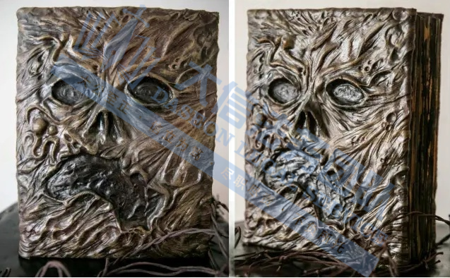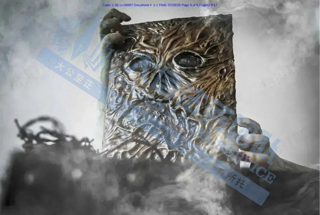 原告是一位美国艺术家,擅长将实用物品与恐怖元素结合。其作品以写实雕刻技法塑造扭曲狰狞的人脸,搭配做旧质感,强化惊悚神秘氛围,在装饰、文创场景具有独特风格。强烈的对比色和超现实构图,营造出令人不适却又无法移开目光的氛围,广泛应用于街头文化、潮牌设计和数字商品中。