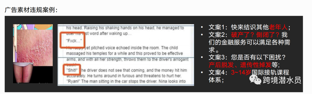 语法和不雅语言:广告不得使用不雅语言以及不规范的语法和标点符号,必须规范地使用符号、数字和字母,不得有意规避Facebook广告审核流程以及其他的政策执行要求。尽量不要出现非规范性文本,譬如一些以使用错误语法、字母等内容为基础网络“黑话”。