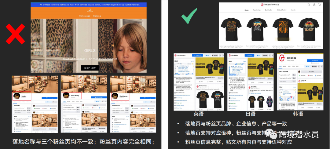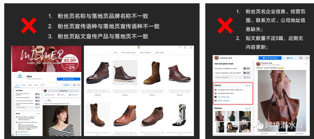 例如:没有任何所销售产品品牌以及网站相关的信息,或者有不同的广告主,不同的公共主页内容完全雷同。