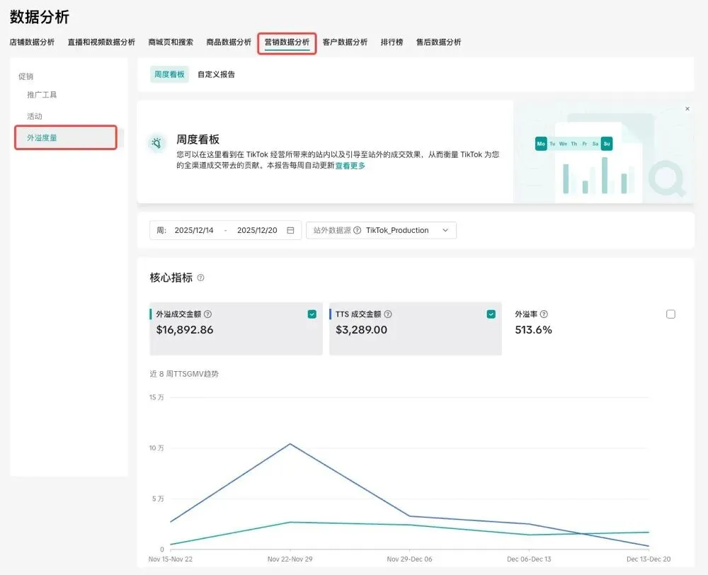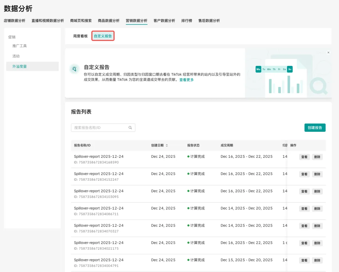 在“外溢度量分析”模块中,卖家还可以自制自定义报告标签页(位于“周度看板”旁),创建个性化报表,用于追踪由 TikTok 驱动的交易表现(覆盖站内 + 站外)。