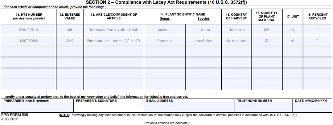 在进口方面,PPQ 通过制定有效的法规和政策,决定哪些植物和植物制品可以进口,哪些存在高风险而应被禁止进口。PPQ Form 505 则是该部门根据《莱西法案》(Lacey Act)要求规定的植物及植物制品进口申报表(Plant and Plant Product Declaration),用于申报进口商品中所有植物来源材料的种类、学名、采集国家、数量及再生比例等信息,以满足植物检疫与 Lacey Act 的合规要求。