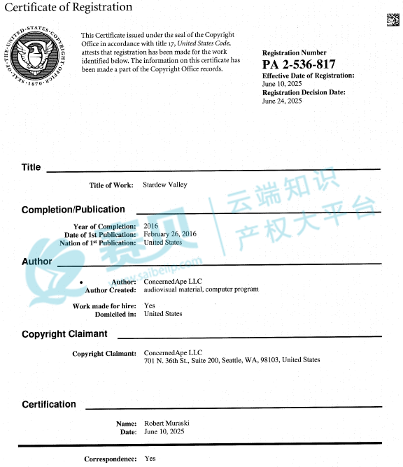 同时涉及《星露谷物语》的美国注册了版权,注册号是PA 2-536-817,保护的是游戏里的视听素材和计算机程序。